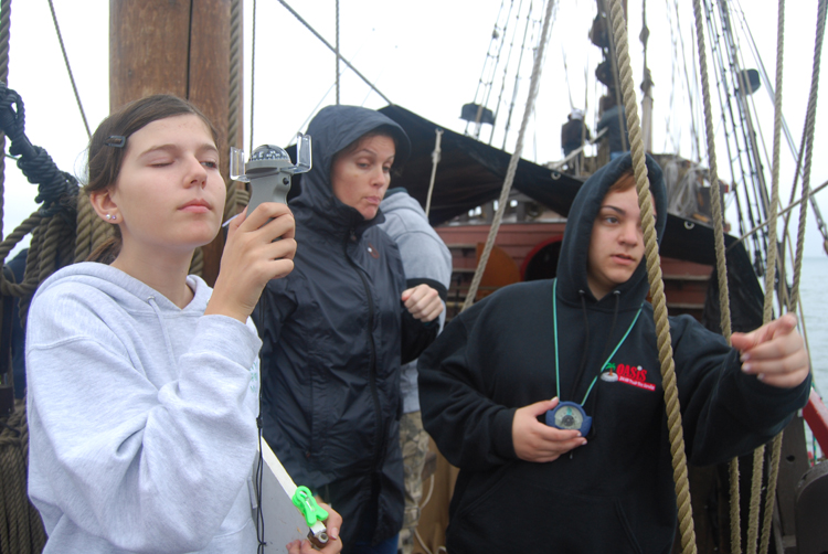 5th Entry, 0854 Hours: Throughout the day, as the Half Moon continues on its journey, the research teams turn their attention to collecting data for their final presentation projects. In the morning, with the fog still blotting out the sun, Hannah and Rachael practice for their celestial navigation project by training their instruments on somewhat closer targets, such as breakwaters and landmarks on shore.