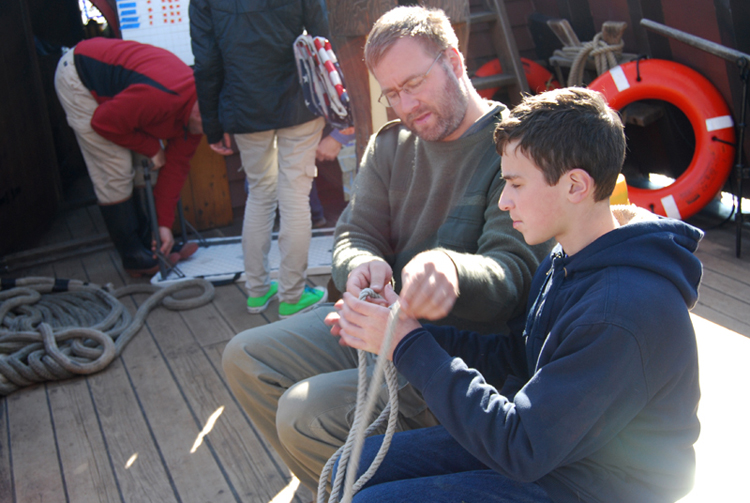 2nd Entry, 1053 Hours: As the students complete their preparations, they also find themselves with time to pursue personal interests. Like other students on board, Cameron C. is intent on learning new knots from Mr. Burmester.