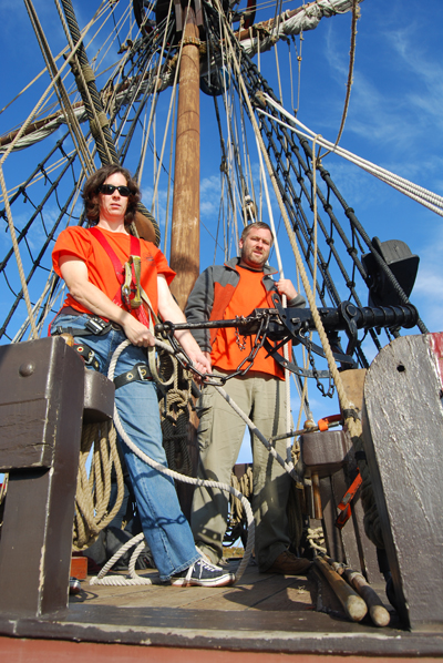2nd Entry, 0830 Hours: As soon as the ship's gunners have finished firing their salutes, Ms. Reilly and Mr. Burmester stand ready to hoist the fore tackle for the Zodiac. Once the ship's tender boat is clear of the river, we pick up speed.