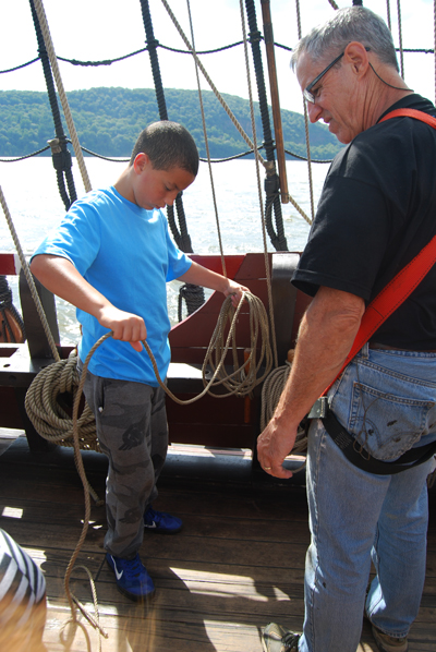 Students then learn how to properly coil lines to keep them tidy. We aren't just being neat; when we handle the sails, so many lines are in use at once that if the crew doesn't work to keep them organized, the lines can rapidly turn into an unworkable tangle.