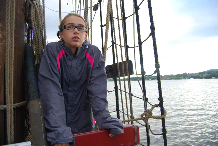 Lookout: The student stands at the fore mast on the foredeck, scanning the waterway ahead for traffic and potential hazards, calling back what they see to the Quarter deck. This is necessary because, due to the method of construction of 17th century vessels, the Quarter deck officers' view directly ahead of the ship is obstructed by the foredeck itself.
