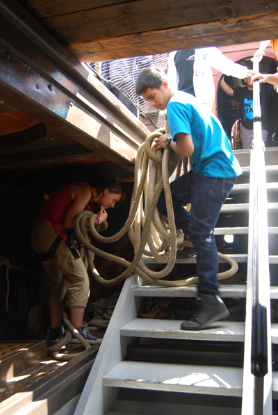 Entry One, Part 7 of 8: 1338 Hours: Other students are busy elsewhere. Htatmyat helps Ms. Stevens haul Dockline Three down to the orlop deck, where it can be stowed out of the way. The ship won't be returning to shore until we return to King Marine at the conclusion of this leg of the voyage.