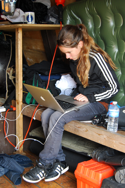 Entry Two, Part 7 of 8: 1256 Hours: With the Half Moon now at rest, the students have a few minutes to relax. Femke takes a few minutes to review her video footage in the forecastle. Forgive the clutter; during Voyages of Discovery, the forecastle serves as storage space, living quarters, and science cabin all in one.