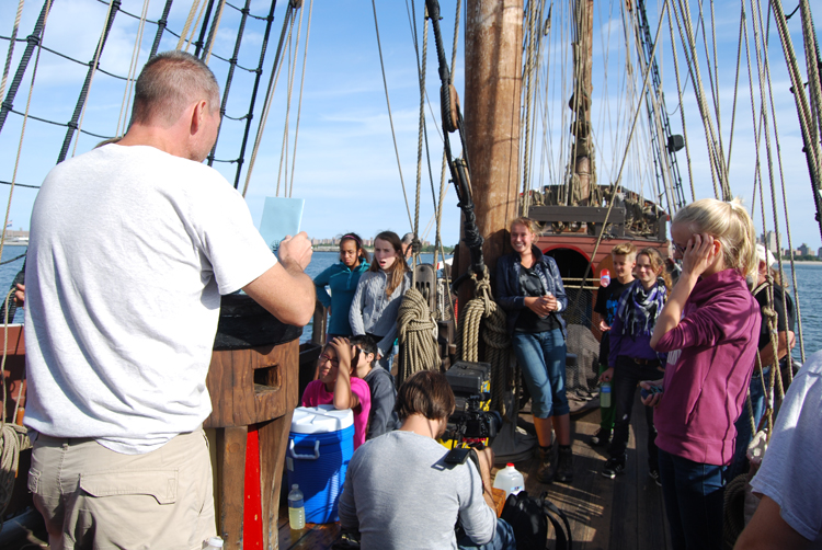 Entry Three, Part 7 of 8: 1623 Hours: As the afternoon wends onward and orientation continues, Mr. de Leeuw gathers the crew around the capstain and hands out the Crew Rating Logs, introducing a little friendly competition between the Dutch and American crew members as he does so. Who will be the first to pass the captain's tests and rise in the ranks?