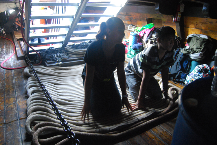 Entry One, Part 4 of 8: 0750 Hours: The rode ends up returning to where it started at the bow of the ship, where today's fakers Marrit and Htatmyat fold it into an orderly pattern. Before you know it, the Half Moon is underway.