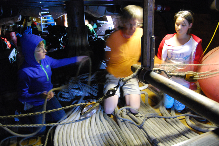 Entry Six, Part 6 of 8: 1834 Hours: Once the anchor's set, Mr. Groenestein recruits Jodi and Tajbe to help him lash the tiller, securing to prevent waves or wakes hitting the rudder from causing the whipstaff to unexpectedly jerk back and forth. They work quickly -- more quickly than the camera can follow!