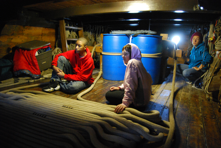 Entry One, Part 3 of 8: 0652 Hours: At the fore, Ms. Stevens is tending the bits, putting turns on the bits on command as a safety precaution. She's joined by Theotis and Jodi, who will be "faking" the line. In this case, faking the anchor rode means neatly folding it once it completes its journey around the capstan so it can be deployed again as needed.