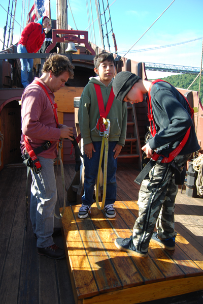 Entry Two, Part 1 of 8: 0921 Hours: As we pick up with Day Two of our Voyage of Discovery, the Half Moon is currently traveling north past Poughkeepsie, and the student crew are contininuing their shipcraft orientation. On the weather deck, Mark Morel shows Eb and Miskas how to don a safety harness.