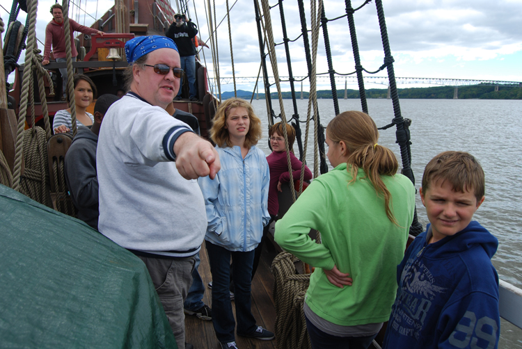 Entry Three, Part 3 of 8: 1344 Hours: Having motored north through the Lange Rack from Newburgh Bay to past the Kingston-Rhinecliff Bridge, we are now ready to bring the Half Moon around and take advantage of the northerly wind, using it to sail back south to our anchorage. Mr. Prime assigns the student crew members to various dousing lines so we can set sail.