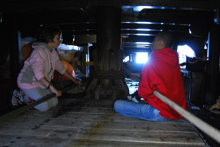 Entry One, Part 7 of 8: 1034 Hours: Abaft the main mast, Jodi and Theotis tend the rode as it passes around the lower capstan.