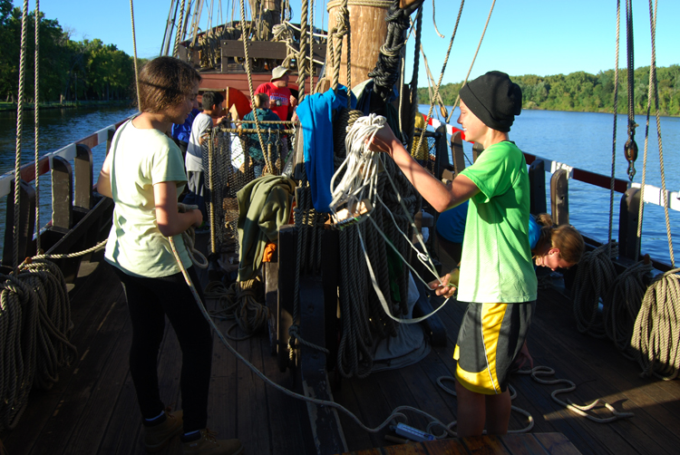 Entry Three, Part 8 of 8: 1735 Hours: And that's a wrap! The student presentations are complete! Sofia, Miskas, and Juliana break down their block-and-pulley rig after the show's over. You'll be able to find more details about the student projects in the Learning Pages in the coming days.