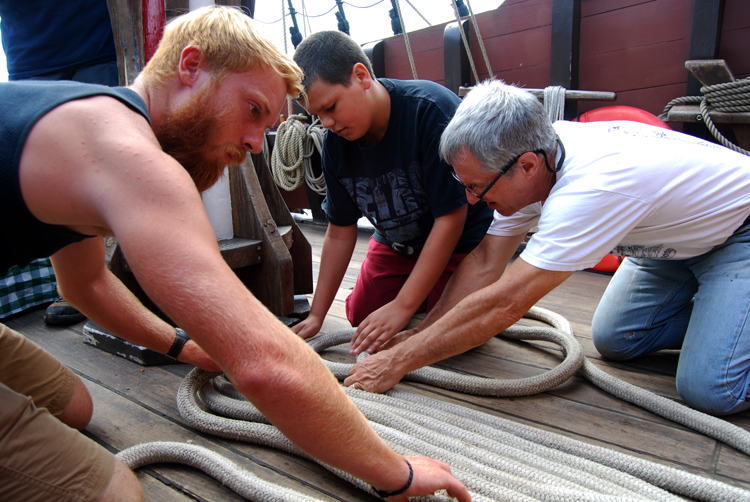 2nd Entry, 1333 Hours: The ebb tide has arrived, and with it, the beginning of our voyage. On the weather deck, Stephen pitches in with Mr. Powell and Mr. Lyke to fake (neatly fold) Line Three, one of the ship's docking lines. Our departure is imminent!