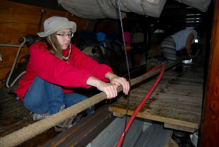 1st Entry, 0842 Hours: As the anchor rode passes into the ship, Kira helps guide it along, preventing it from accidentally catching on our water hose and any other potential snags. Ms. Groenvelt tends the rode as it passes around the lower capstan. Her task is to prevent overrides (snags) which could bring our work to a sudden halt.