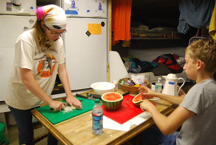 2nd Entry, 1156 Hours: Meanwhile, Kira and Wouter are hard at work in the galley, cutting vegetables for lunch and an afternoon snack.