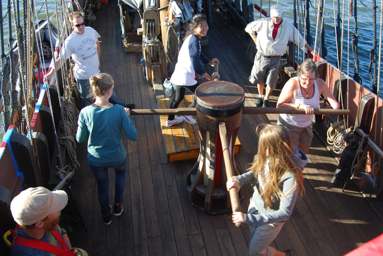 5th Entry, 1740 Hours: One last task before we can all it a day. We aren't far from our final destination, but the weather forecast is now predicting winds and rain that will making docking unnecessarily complicated if we wait for morning. Instead, the crew bands together to weigh anchor and head for port while the sun is still shining. By luck of the draw, it's the ladies' turn to walk the capstan!