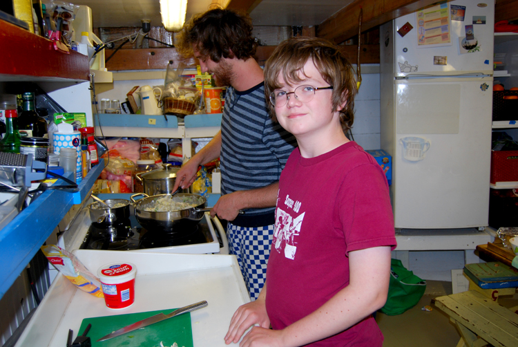 3rd Entry, 1524 Hours: Regular ship's duties continue without interruption while the crew are literally "learning the ropes." On galley duty, Finn helps Mr. Vos prepare dinner. Photo: Doug Lyke
