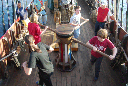 3rd Entry, 1734 Hours: Casey, Cecelia, Finn, and Mason walk the capstan to haul in the anchor rode. Mouse over (or click on) the image to the right to see them in action!