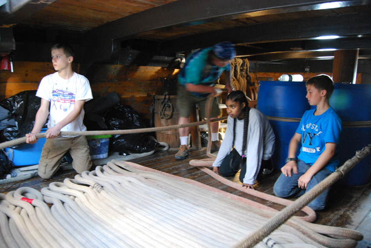 3rd Entry, 1736 Hours: Just past Calum, Mr. Prime tends the bits, ready to put a turn on the rode at a moment's notice — a standard safety precaution. Lalitya and Chris are the fakers, in charge of "faking" (neatly folding) the anchor rode once it reaches their position.